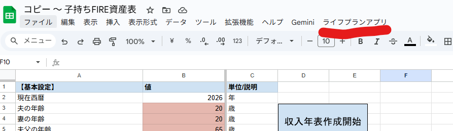 シートを開いて数秒〜10秒ほど待つと、メニューバーの右側に「ライフプランアプリ」という独自のメニューが追加されます。