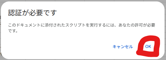 この後、Googleの仕様により「このアプリは確認されていません」や「すべてのスプレッドシートの参照(共有)」といった強い警告画面が表示される場合があります。