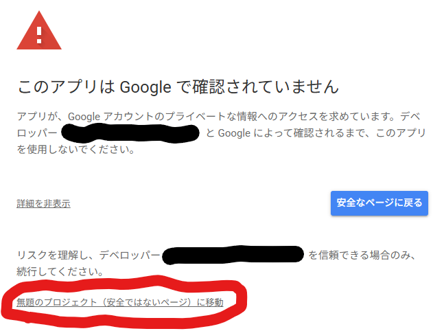 - 「無題のプロジェクトがGoogleアカウントへのアクセスを求めています」とでたら「続行」をクリック