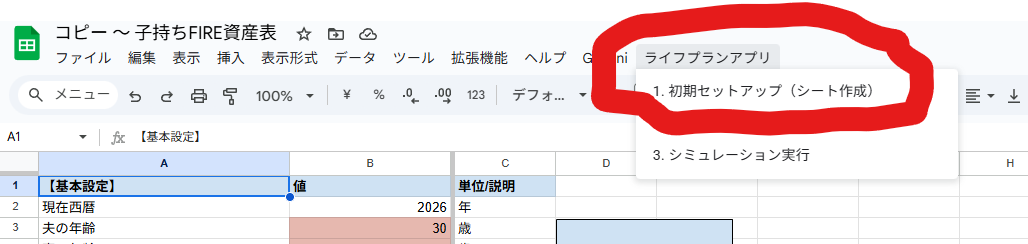 「ライフプランアプリ」>「1. 初期セットアップ(シート作成)」をクリックします。