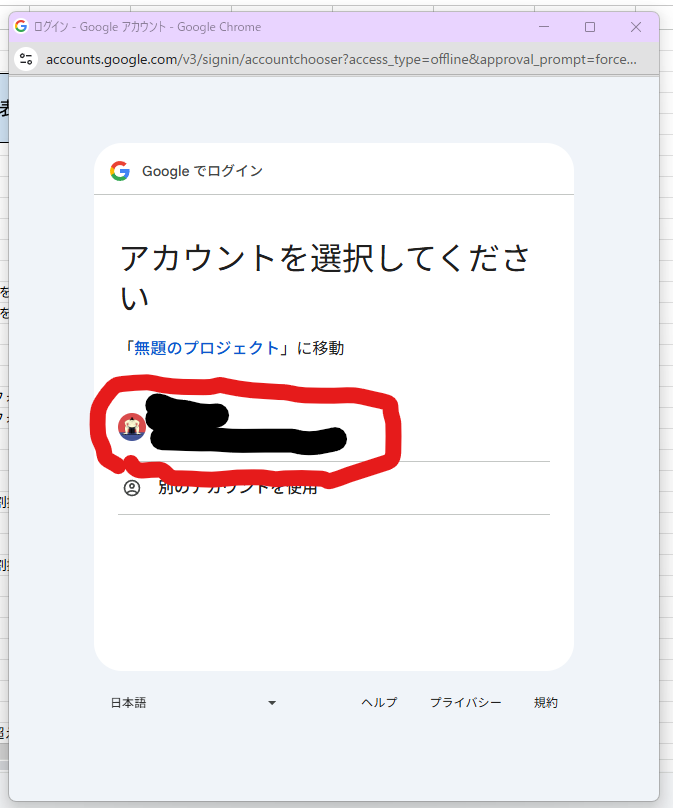- 「アカウントを選択してください」とでたら自分のアカウントを選択