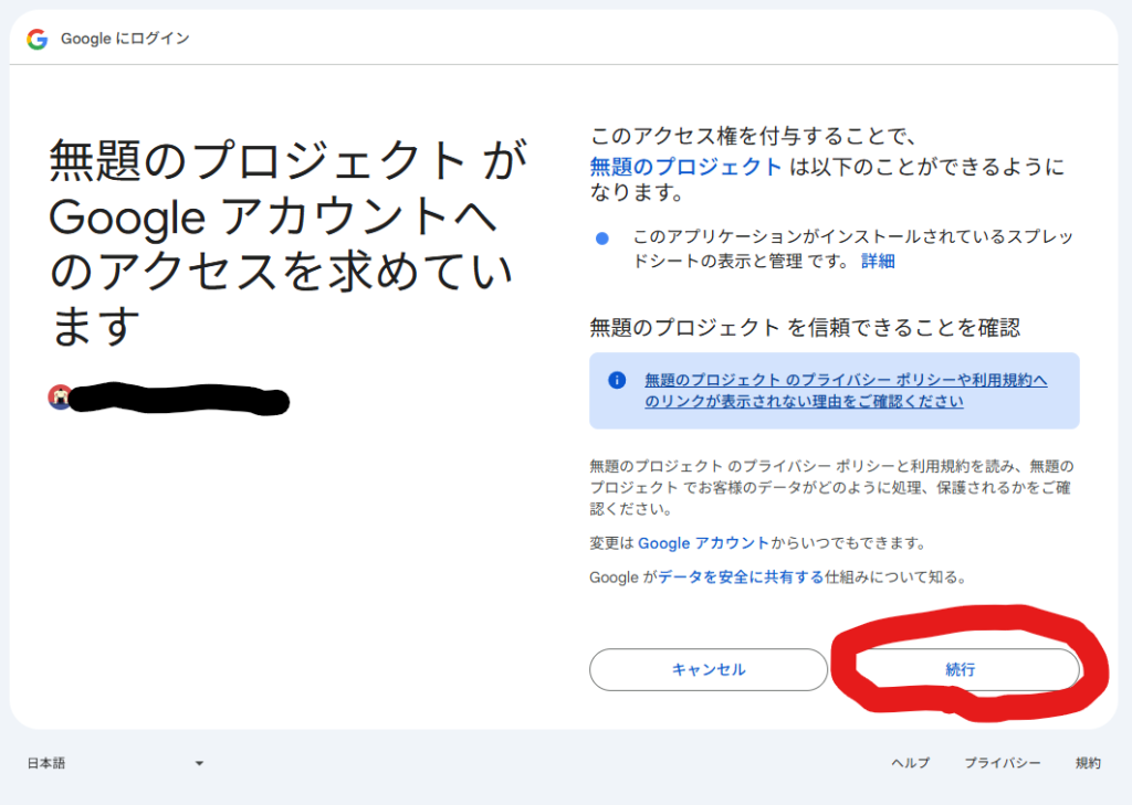 - 「無題のプロジェクトがGoogleアカウントへのアクセスを求めています」とでたら「続行」をクリック